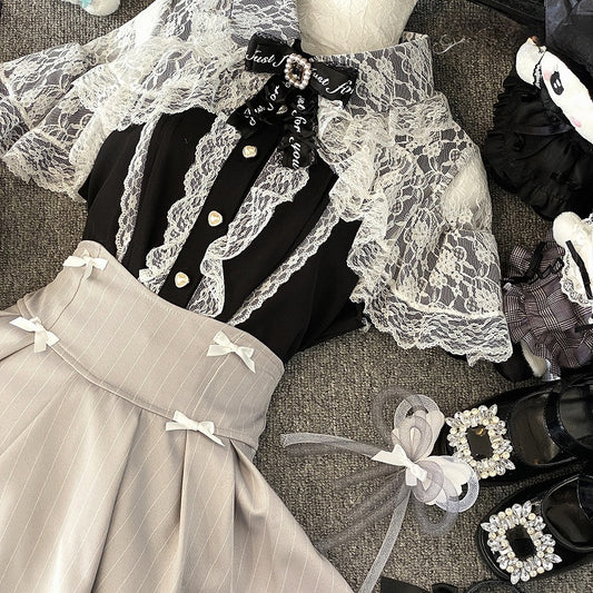 Jirai Kei Black/Blue/White Cutout Shoulder Cape Design Lace Blouse
