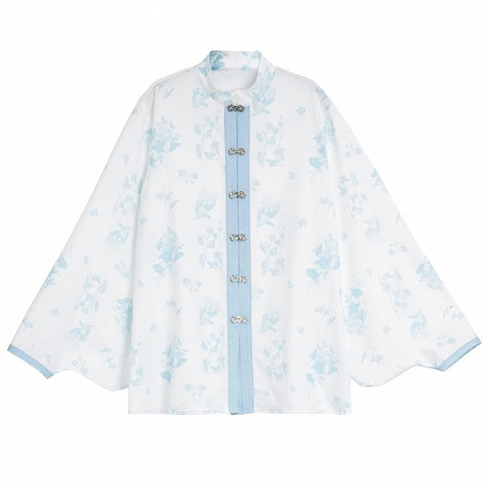 White Floral Pattern Banded Collar Knot Buttons Style Rococo Blue Cheongsam Blouse