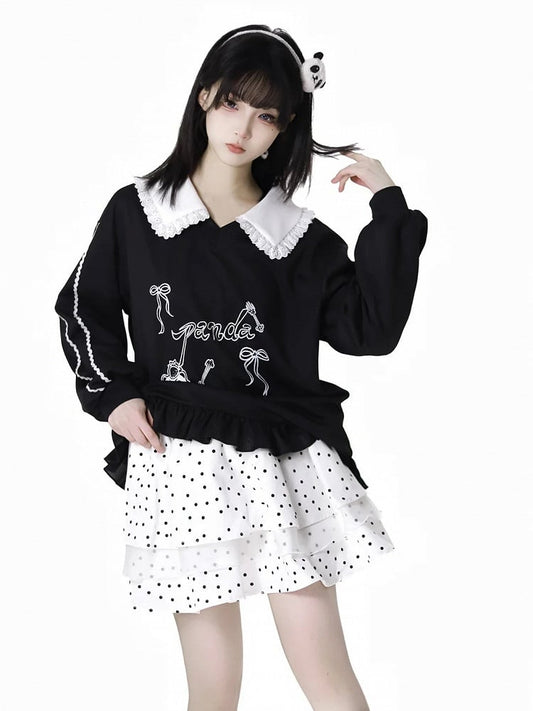 Short/Long Top Sleeves Panda Dessert Print Ruffled Pointed Flat Collar Ruffled Hem Black