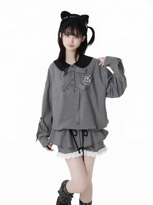Blouse Drawstring Black and White Plaid Peter Pan Collar Bow Accents Cuffs