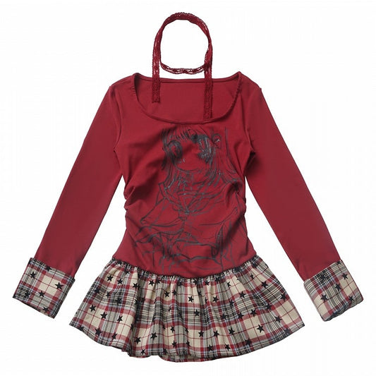 Design Top Round Neck Anime Girl Print Star White/Red Plaid Patchwork Pattern