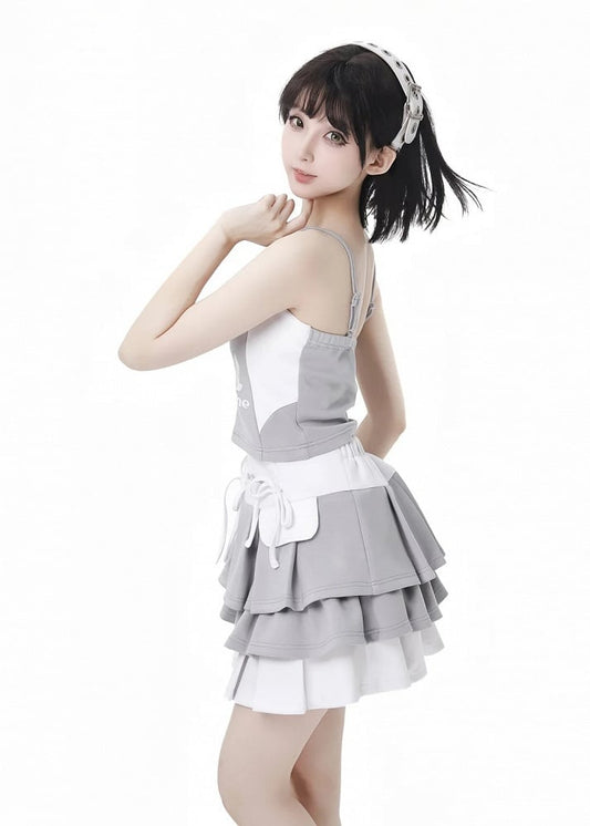 White Colorblock Design Bowknot Tiered Skirt Gray Details