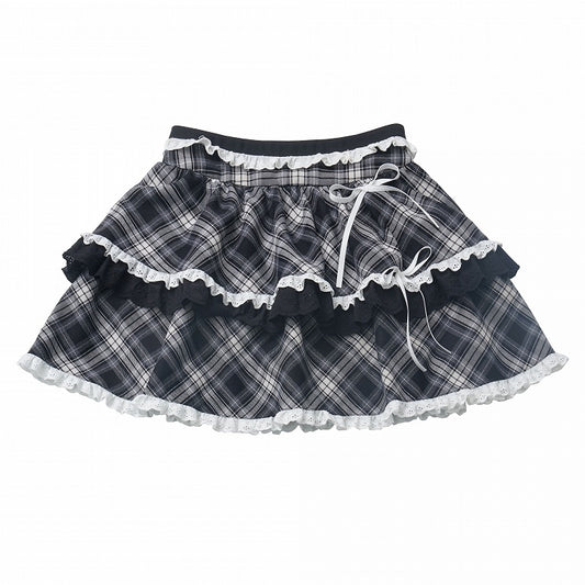 Ruffled Lace Trim Bowknot Details Tiered Skirt Black Plaid