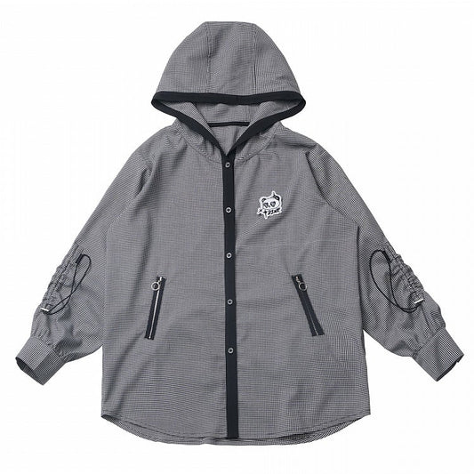 White Plaid Panda Embroidery Drawstring and Black Cuffs Hooded Top