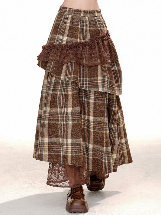 Brown Plaid Shirring Waist Lace Patchwork Skirt