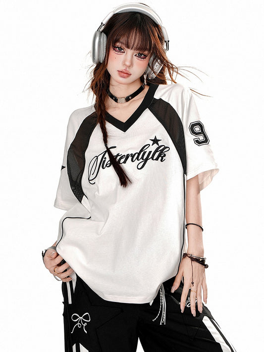Black/White V-Neck Short Sleeves Sports Top
