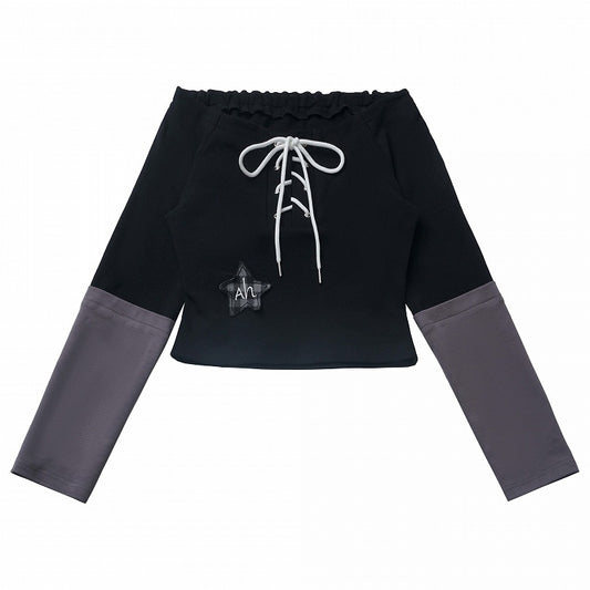 Black Star Applique Lace-up Detail Off-the-shoulder Neckline Top