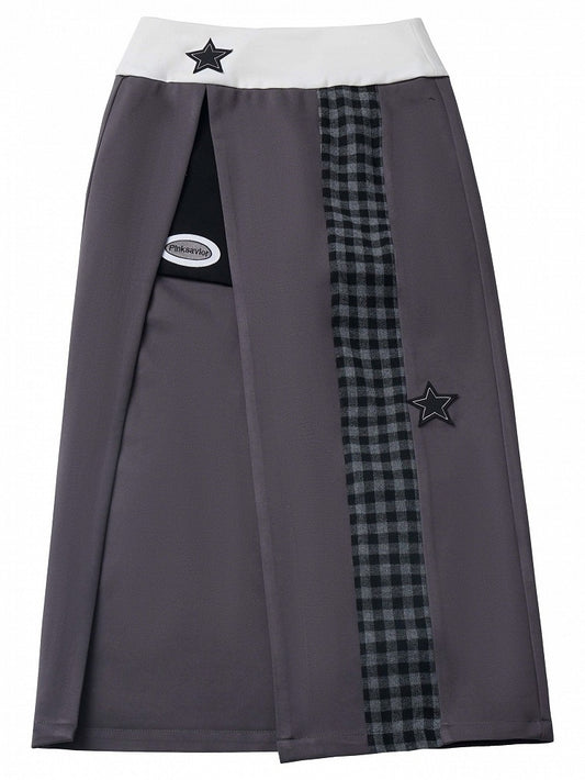 Gray-purple Star Appliques Thigh-high Slit Plaid Pattern Long Skirt