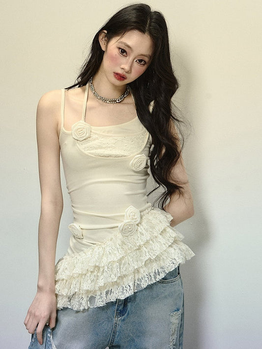 Apricot Floral Embellishments Cami Top with Asymmetrical Tiered Hem