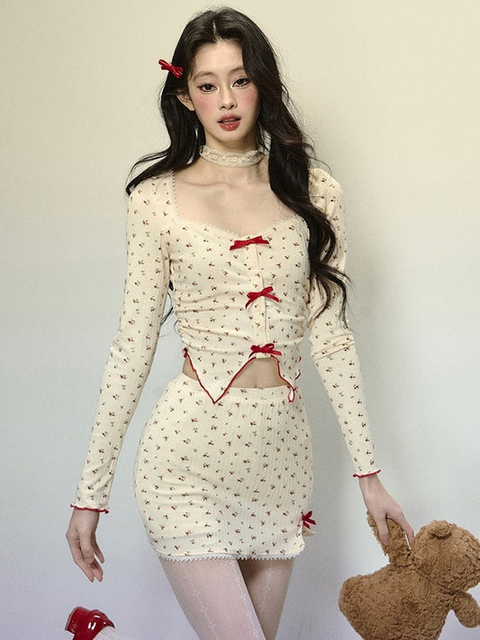 Apricot Floral Pattern Square Neckline Crop Top with Bowknot Details