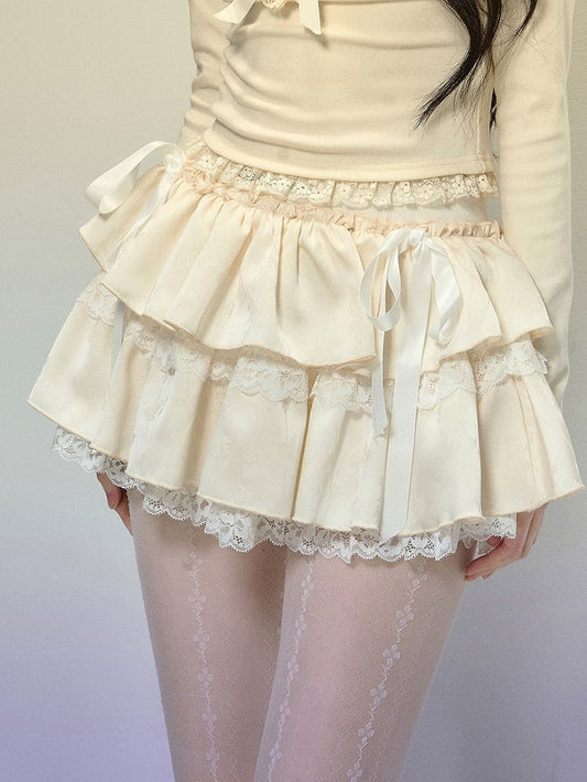 Apricot Bow Accents Lace Trim Tiered Mini Skirt