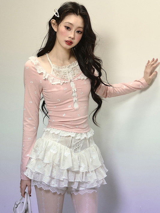 White Lace Floral Pattern High Waist Tiered Mini Skirt Lace-up Detail