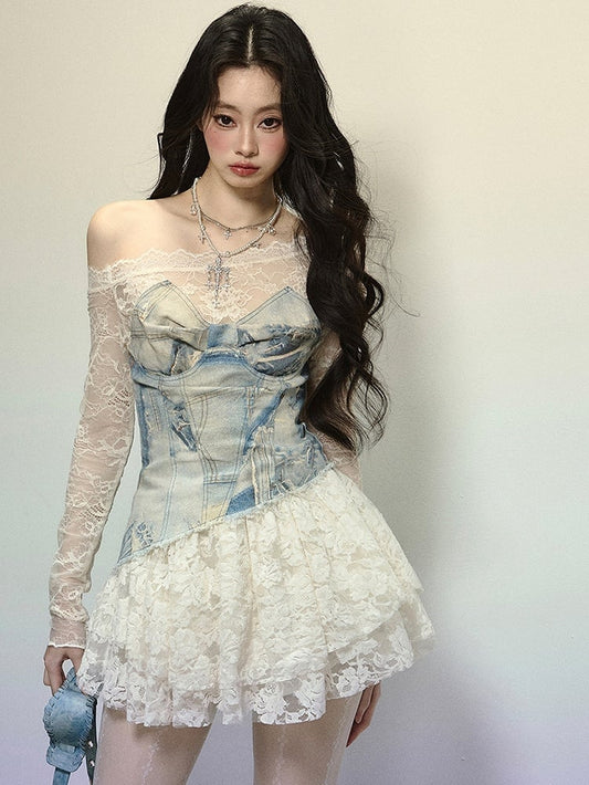 Blue Lace Patchwork Denim Asymmetrical Neckline Mini Dress