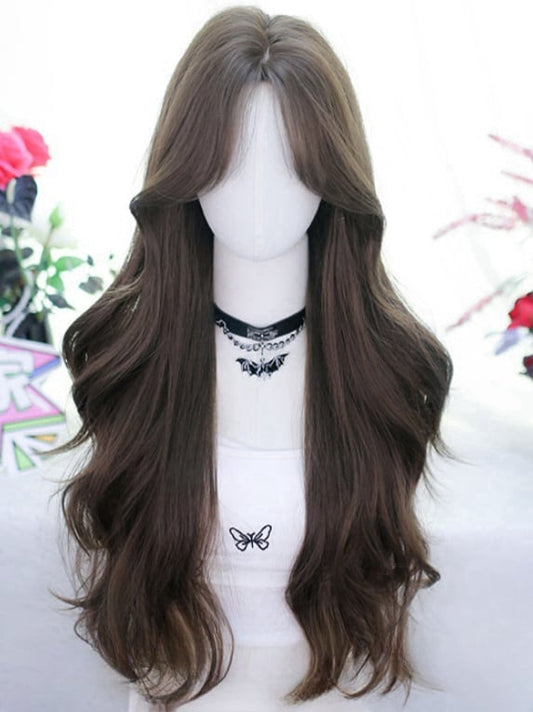 Brown 65-70CM Waist Length Wavy Wig With Curtain Bangs