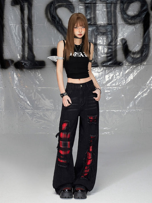 Black Distressed Holes Plaid Pattern Straight-leg Cut Jeans