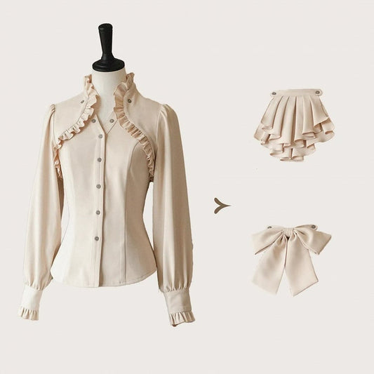 Apricot Ruffled Banded Collar Elegant Long Sleeeves Shirt with Detachable Bow/Jabot Tie