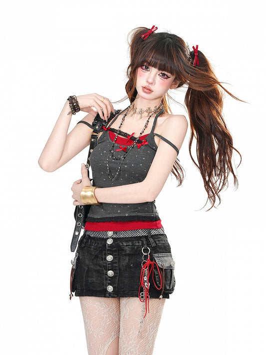 Gray/White Halter Neck Bowknot Details Faux Two-Piece Glamorous Cami Top