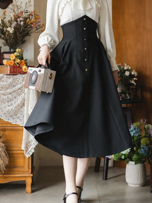 Black Elegant Vintage Boned High Waist Midi Length Striped Fabric Lolita Skirt