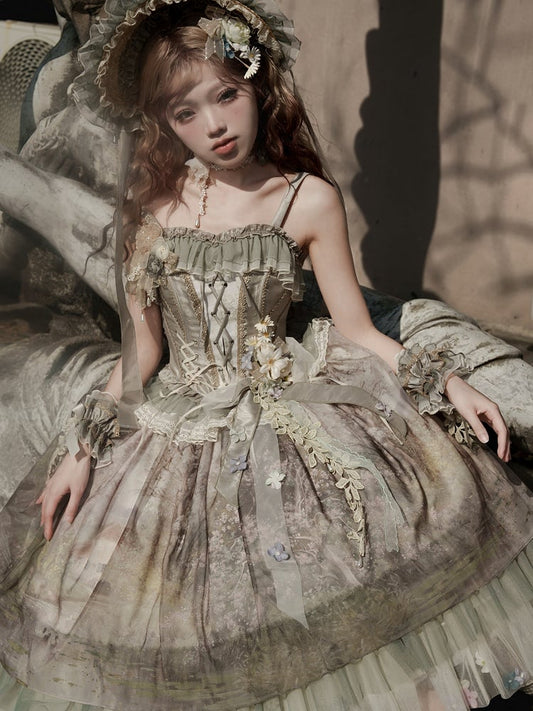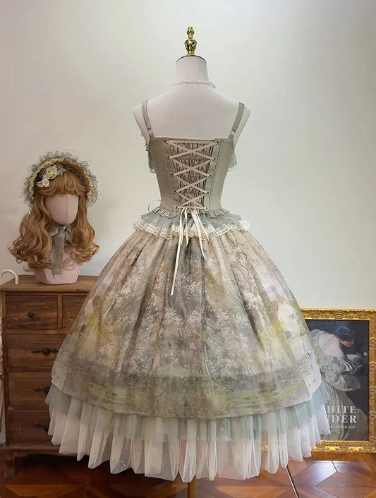 Green Oil Painting Print Flowers Tulle Hemline Lolita Skirt