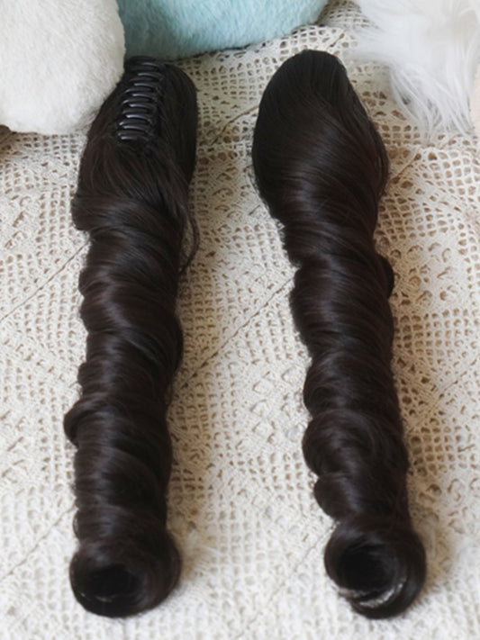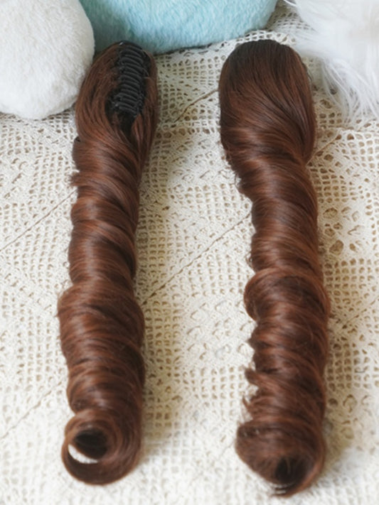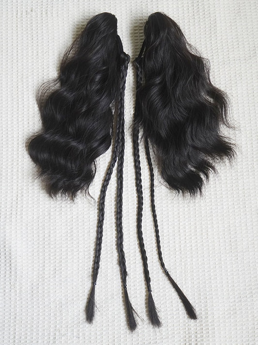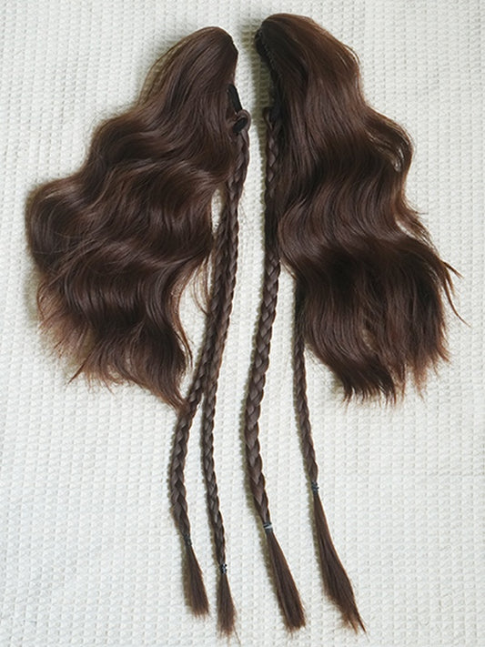 Black Tea Bob Cut Short Wig With Bangs+Double Wavy Ponytail Claw Clips