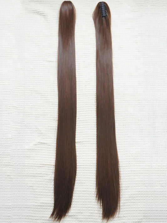 Black Tea Bob Cut Straight Wig With Bangs+Double Long/Short Ponytail Claw Clips