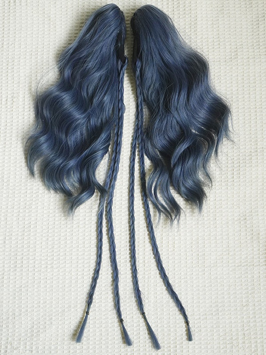 Dusty Blue Bob Cut Short Wig With Bangs+Double Wavy Ponytail Claw Clips