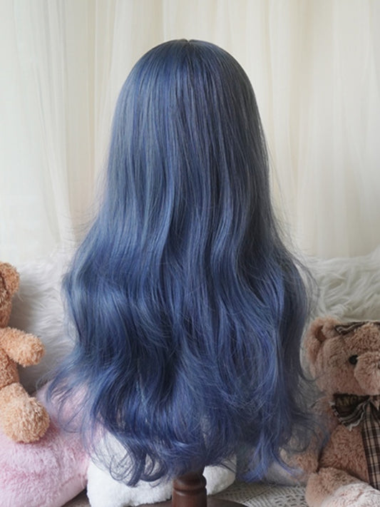 Rose Red/Dusty Blue Under Bust Length Wavy Wig With Bangs