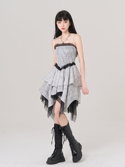 Gray Handkerchief Hem Ruffled Lace Trim Vintage Cami Dress