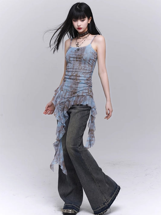 Light Blue Asymmetrical Flounce Hem Ruched Waist Glamorous Cami Top