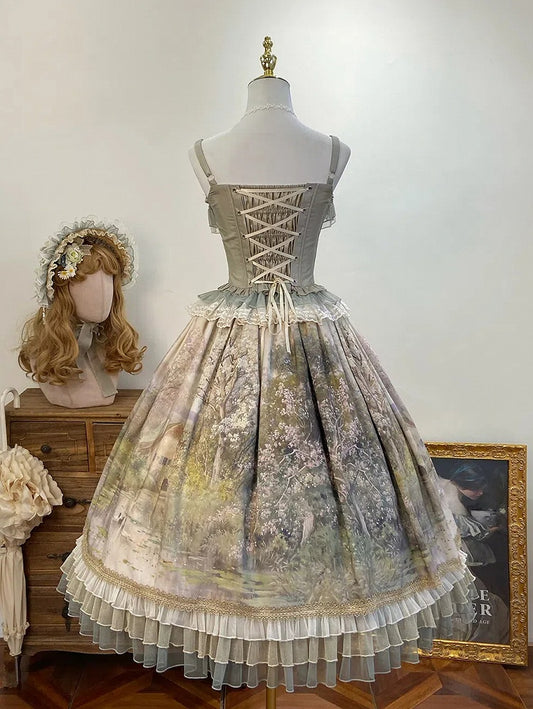 Oil Painting Print Green Layered Ruffle Hemline Lolita Skirt