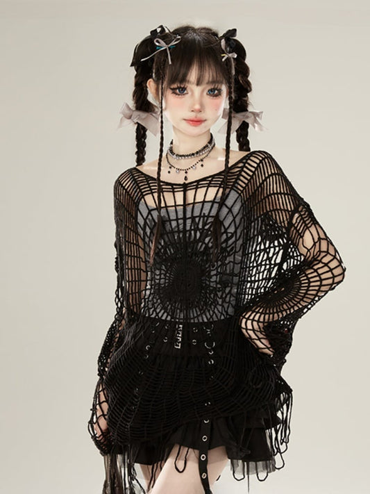 Apricot/Black Spiderweb Design Hollow-out Loose Top