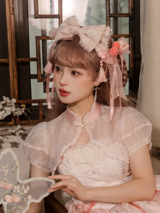 Pink Cheongsam Collar Creamy Puff Sleeves Cropped Top