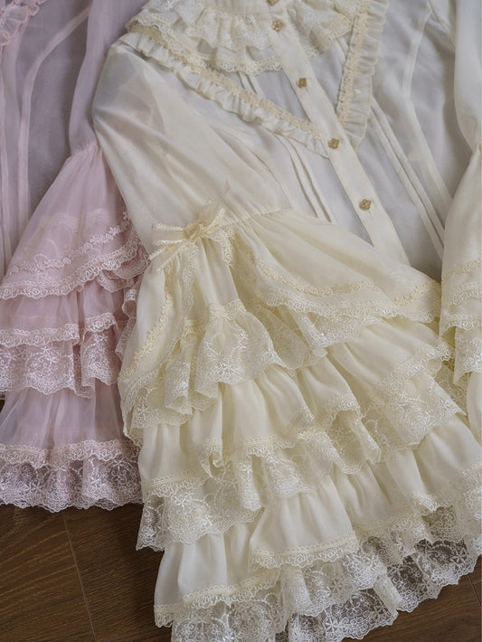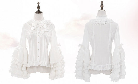 Creamy Bell Sleeves Han Lolita Blouse with Small Pink Bowknots