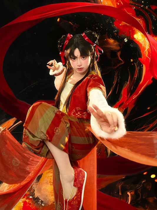 Red Cheongsam Style Floral Loose Pants With Overlay