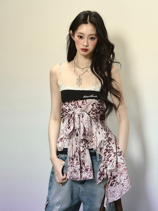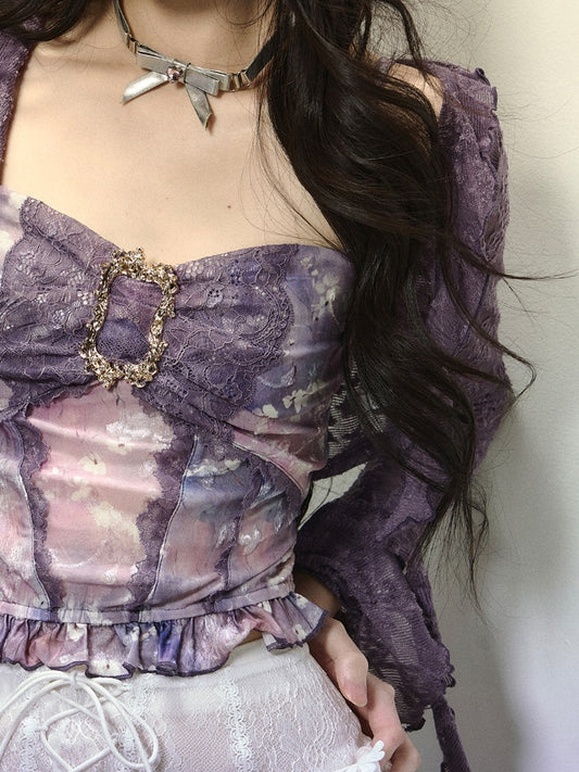 Lavender Oil Painting Lace Bow Ruffled Trim Glamorous Cropped Cami Top