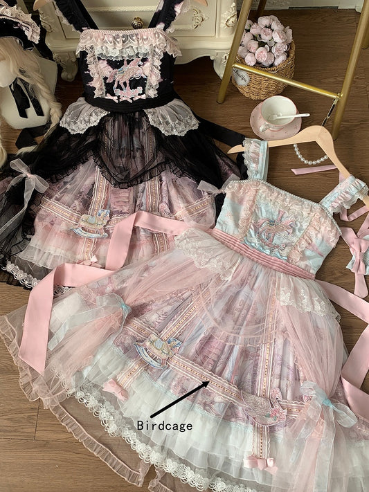 Black and Pink Curtain Tulle Overlay Flying Horse Print Skirt Lolita Jumper Skirt