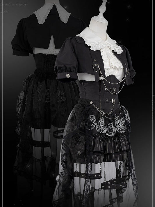 Black and White Prince Ouji Lolita Outfit - White Sleeveless Shirt + Black Cropped Top + Hiigh Waist Blommer Shorts Full Set