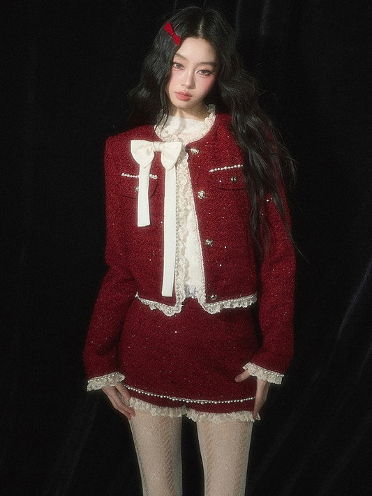 Christmas Red Tweed Cropped Jacket Lace Trim Bowknot and Bead Details