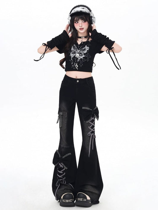 Flare Lace-Up ow Accents Detail Jeans Y2K Silhouette Black with Design