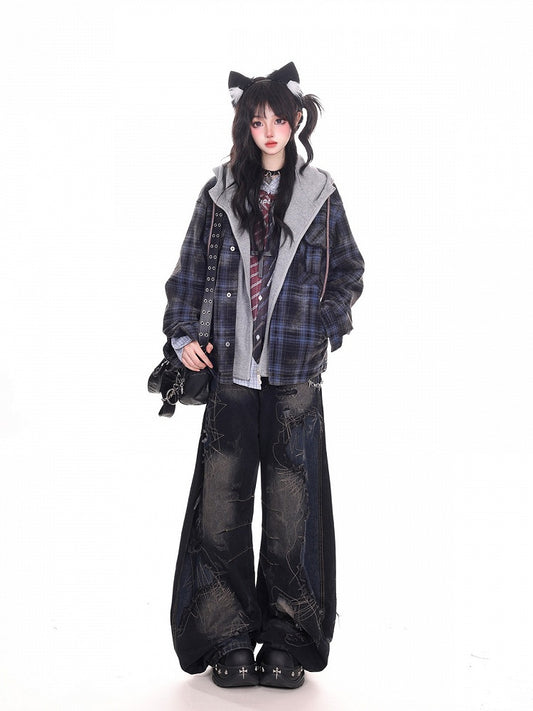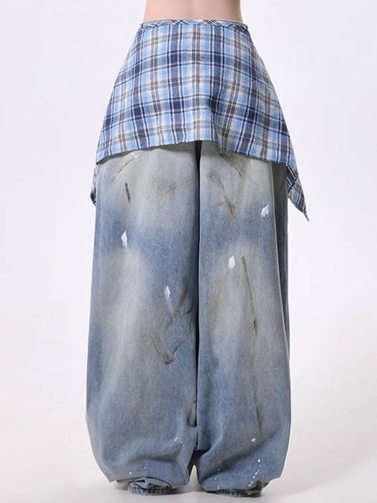 Handkerchief with Plaid Blue Hem Jeans Distressed Wide-Leg Detachable Skirt