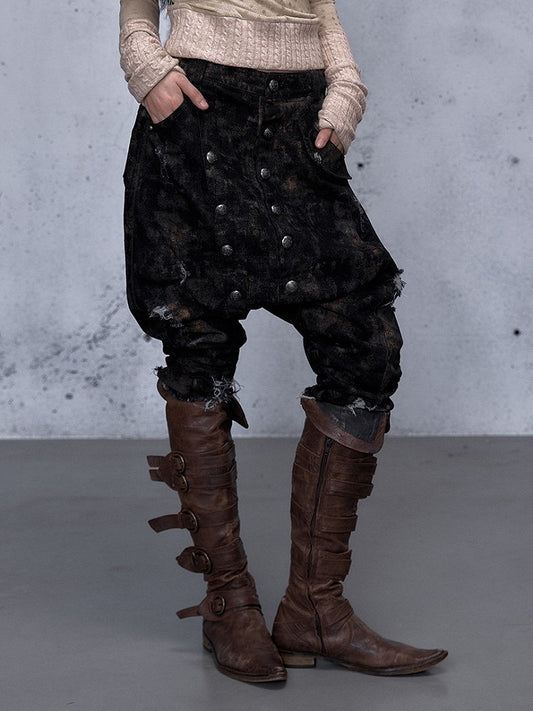 - Elastic Harem Cropped Partial Wasteland with Distressed Punk Waistband Design Jeans Black