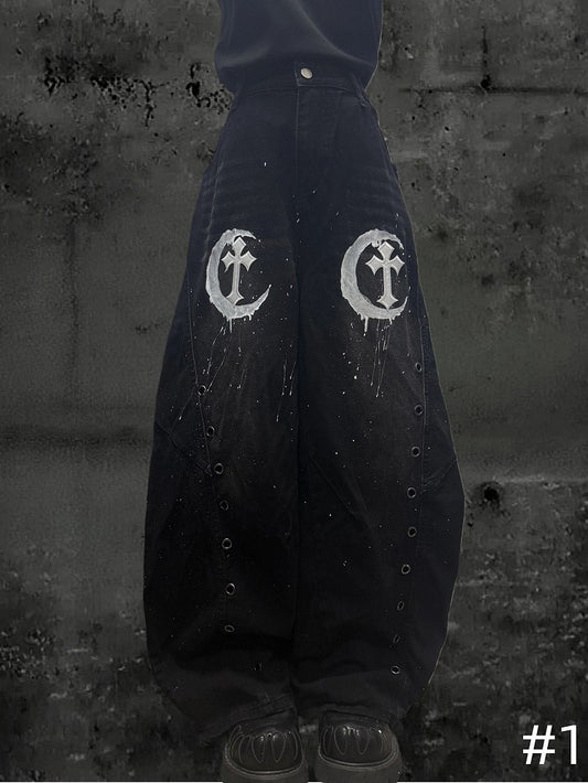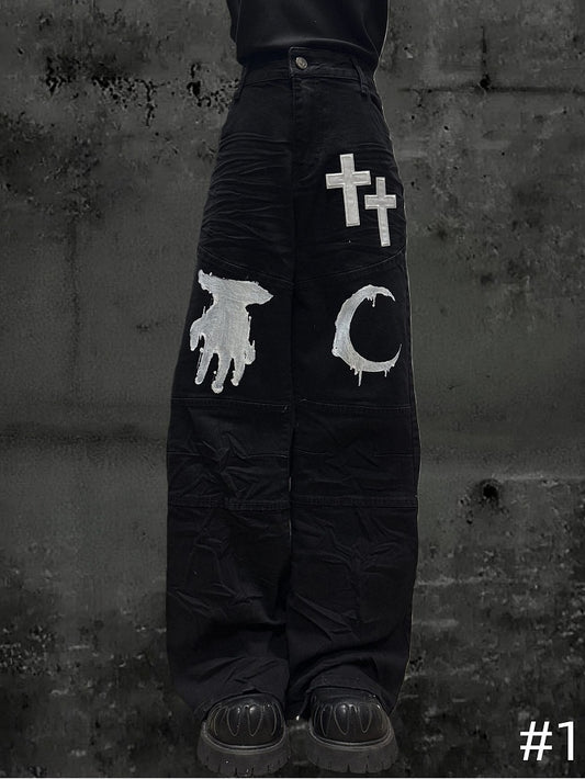 Moon with Pattern Black Cross Wide-leg Hand Jeans Patch Y2K