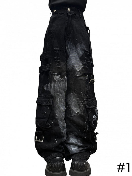 Design Cargo Black Pockets with Jeans Wide-leg Distressed