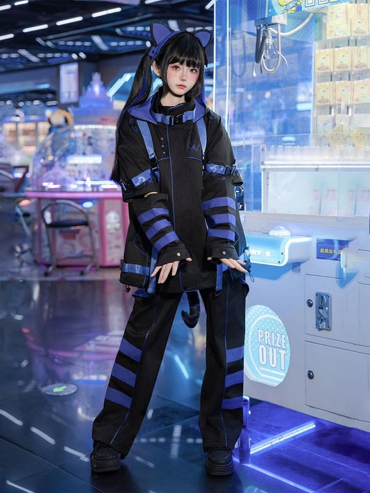 Shorts/Pants Purple Outfit Warmers + Futuristic Fashion Windbreaker Striped Full - Baggy Straight-leg Leg Cyber Set Black