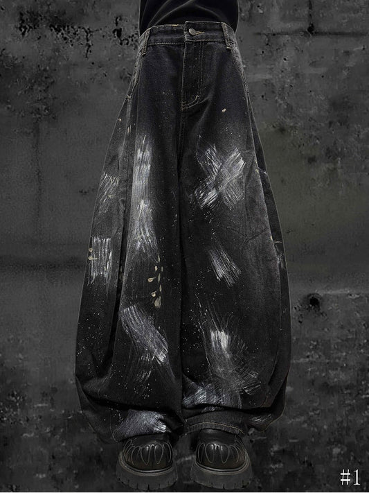 Distressed Graffiti Jeans Paint Wide-Leg and with Black Splatter Cross