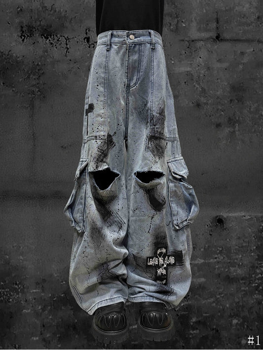 and Blue Distressed Cargo Wide-Leg Edgy with Pockets Jeans Graffiti Accents