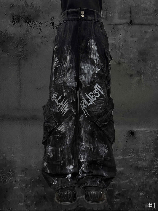 with Cargo Faded Wasteland Wash Paint-Splatter Black Jeans and Wide-Leg Punk Print