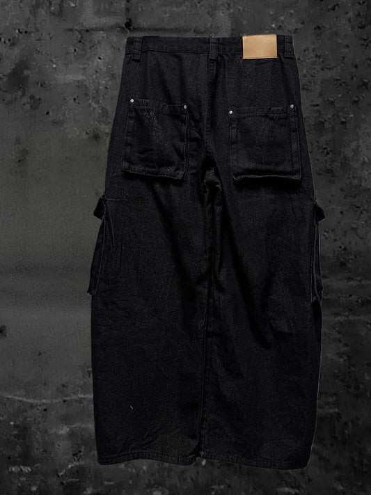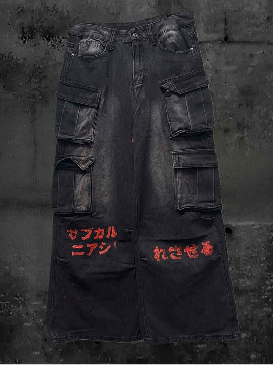 Punk Cargo Skeleton Wasteland Jeans Embroidery and Text with Wide-Leg Black Applique