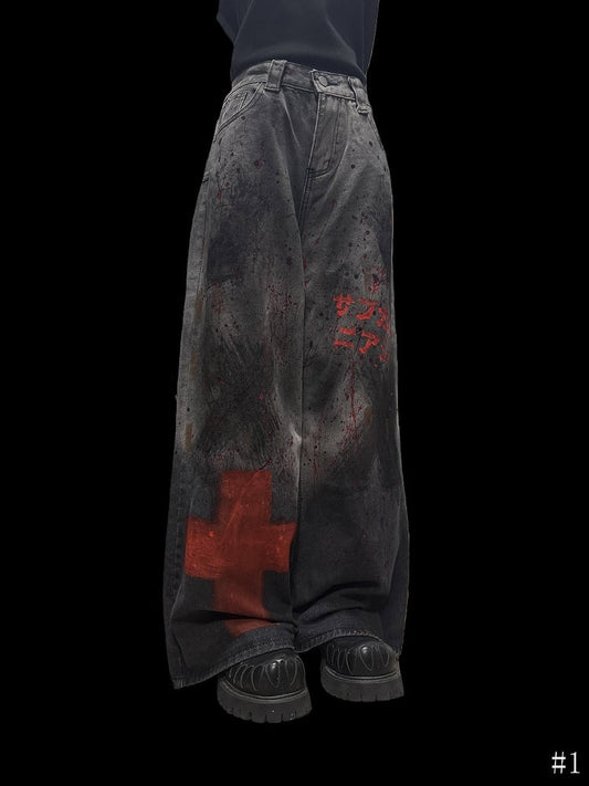 Wasteland Paint and Cross Dark with Wide-Leg Blue Y2K Splatter Jeans Punk Design