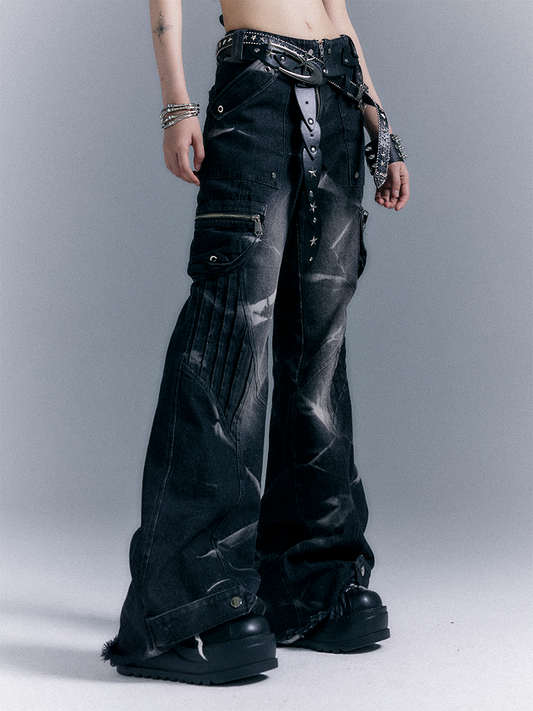 Wash Flared Jeans Cargo Pockets Raw Hem Distressed Faded Black